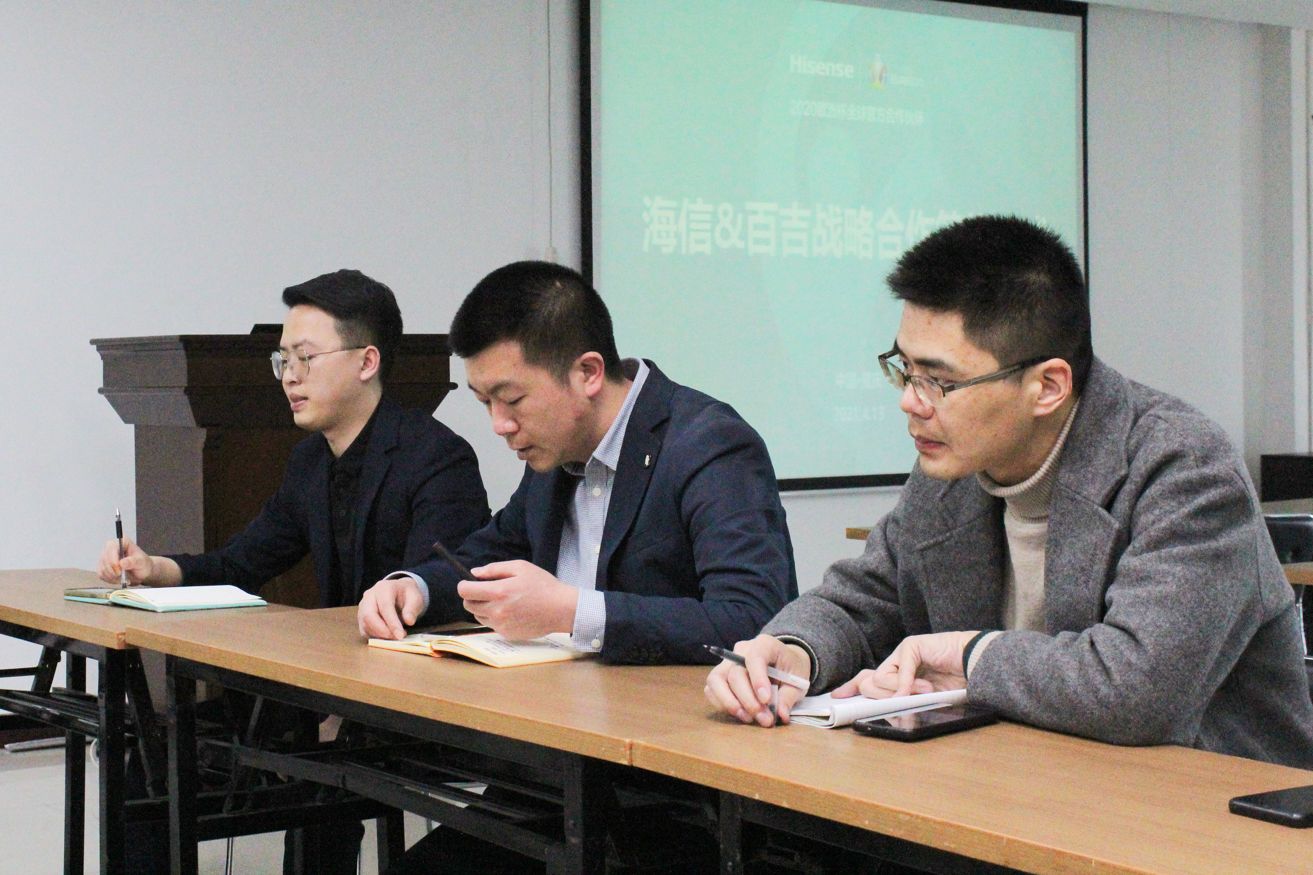 百吉廚電市場總監-趙小龍、KA銷售總監-鄧躍以及海信集團重慶營銷中心大客戶部長-張耀斌 、容聲冰箱營銷部長-楊博、海信空調營銷部長-王浩就戰略合作的細節展開商談,標志著海信與百吉廚電的合作進入了全面戰略合作期